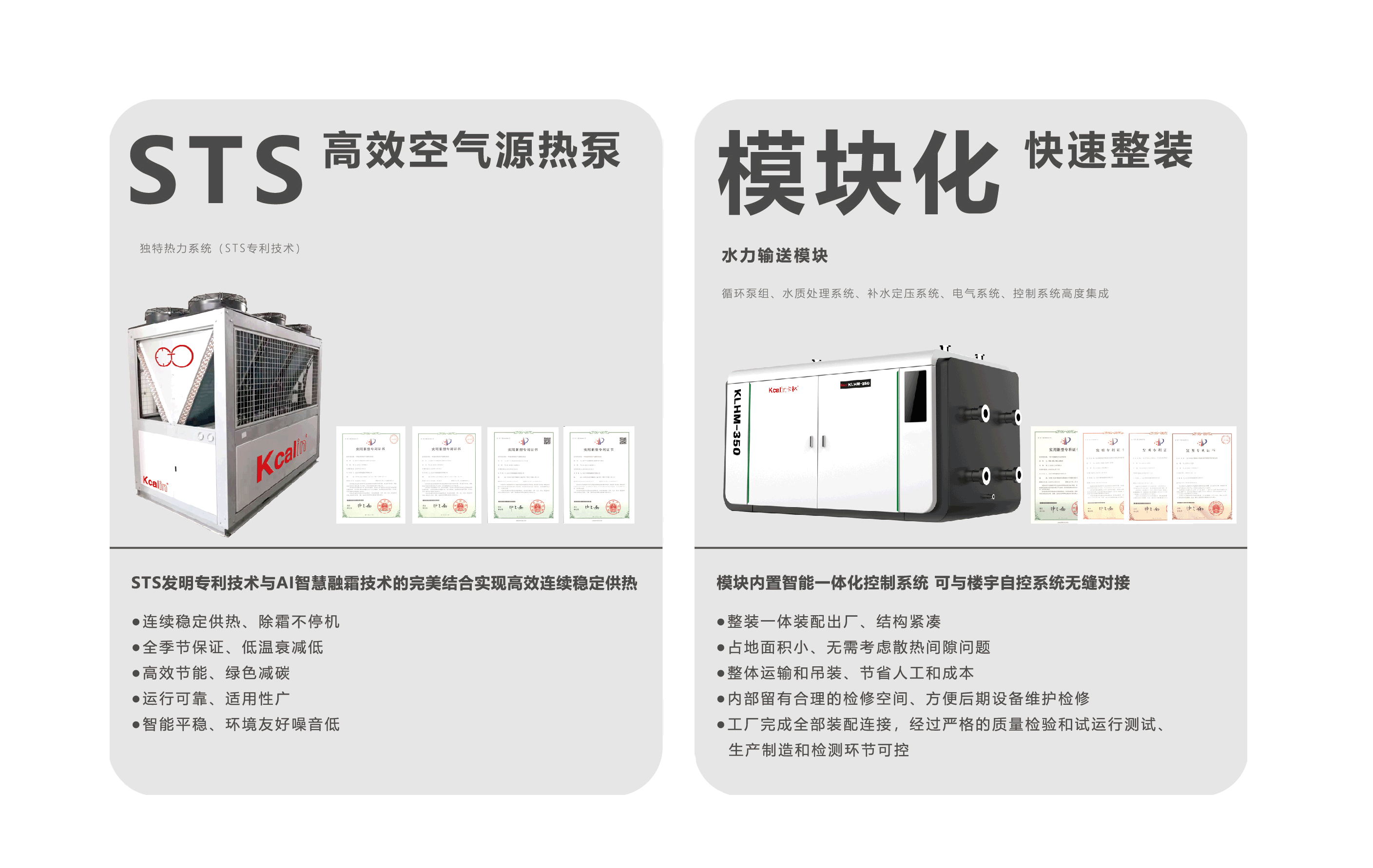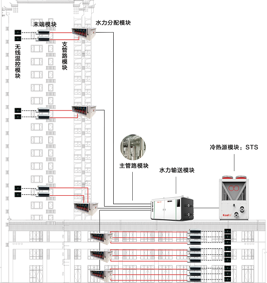 基于卡林自主研發(fā)生產的STS高效熱泵作為冷熱源模塊,利用智能集成裝配式模塊化中央空調系統(tǒng)為用戶實現(xiàn)供暖制冷需求。實現(xiàn)工程產品化、產品模塊化、系統(tǒng)集成化、集成智能化,大幅度降低施工難度、有效減少人力成本,一鍵啟停智能化運行,為建筑綠色節(jié)能賦予新的生機與活力,為實現(xiàn)減碳目標提供可靠的系統(tǒng)解決方案。