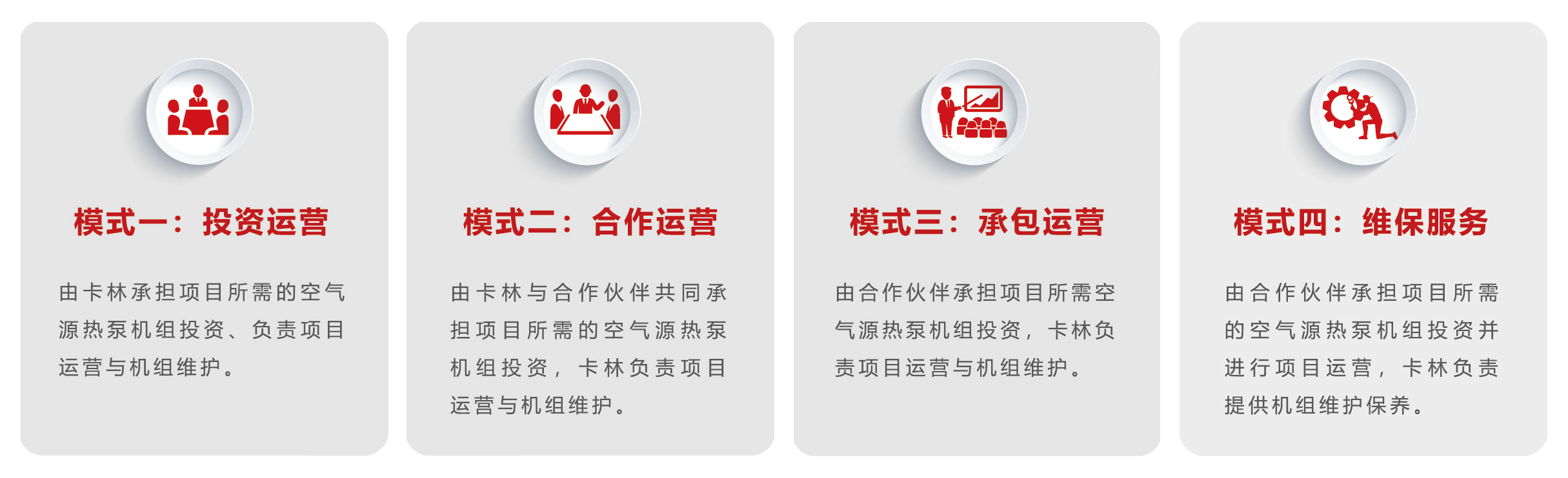 依托STS高效熱泵與智能集成裝配式模塊化中央空調系統(tǒng)的工程系統(tǒng)保障,卡林拓展出熱力運營全程服務模式:由我司提供冷熱源模塊與清潔能源供暖工程建設,在居民小區(qū)、商業(yè)建筑、學校、醫(yī)院等場所建立熱力能源站,為建筑物提供全生命周期的熱力運營保障與服務。目前卡林已在河北、山東等地成立了十余家專業(yè)的熱力運營公司。