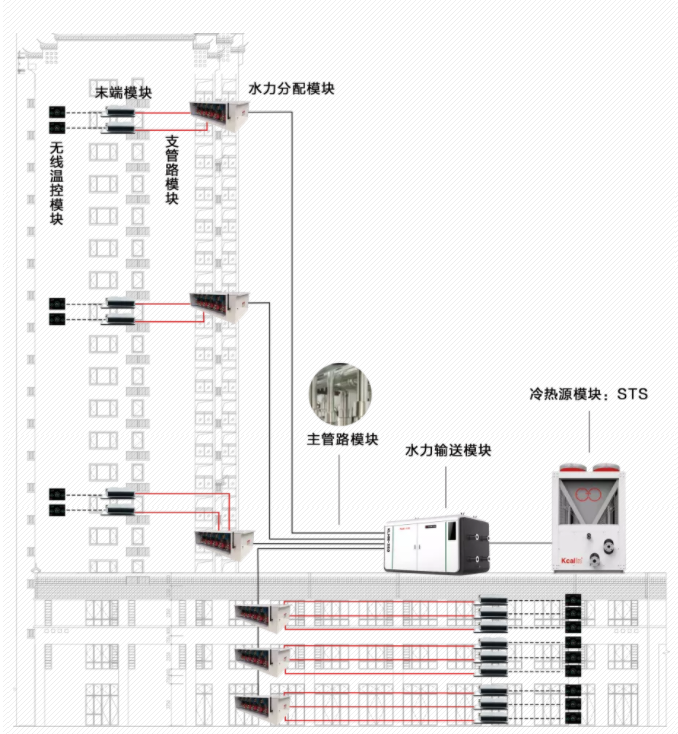基于STS空氣源熱泵作為冷熱源設(shè)備的智能集成裝配式模塊化中央空調(diào)系統(tǒng),全部采用工程產(chǎn)品化、產(chǎn)品模塊化、系統(tǒng)集成化、集成智能化設(shè)計(jì)理念,將冷凍水泵組、冷卻水泵組、水處理裝置、定壓補(bǔ)水裝置及電氣配電、控制系統(tǒng)全部集成于一體,在出廠前完成整機(jī)裝配和測試,作為單臺整體運(yùn)輸,在安裝現(xiàn)場只需連接主管路及主電源即可。內(nèi)置一體化智慧控制系統(tǒng),可與樓宇自控系統(tǒng)無縫對接,遠(yuǎn)程在線大數(shù)據(jù)監(jiān)測,一鍵啟停智能化管理。裝配式模塊化集成智能中央空調(diào)系統(tǒng)可大幅度降低施工難度、縮短施工周期、減少機(jī)房占地面積,智慧控制明顯降低運(yùn)行費(fèi)用,積極響應(yīng)綠色生態(tài),節(jié)能降耗的健康理念。