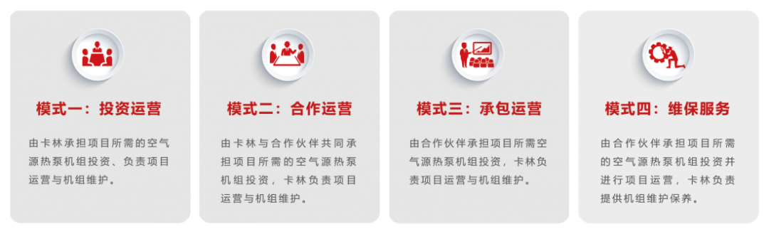 此外,依托STS高效熱泵與智能集成裝配式模塊化中央空調(diào)系統(tǒng)的工程系統(tǒng)保障,卡林拓展出熱力運(yùn)營全程服務(wù)模式:由我司提供冷熱源模塊與清潔能源供暖工程建設(shè),在居民小區(qū)、商業(yè)建筑、學(xué)校、醫(yī)院等場所建立熱力能源站,為建筑物提供全生命周期的熱力運(yùn)營保障與服務(wù)。目前已在河北、山東等地成立了十余家專業(yè)的熱力運(yùn)營公司??譄崃\(yùn)營服務(wù)現(xiàn)有四種模式,可多維度滿足客戶合作需求。